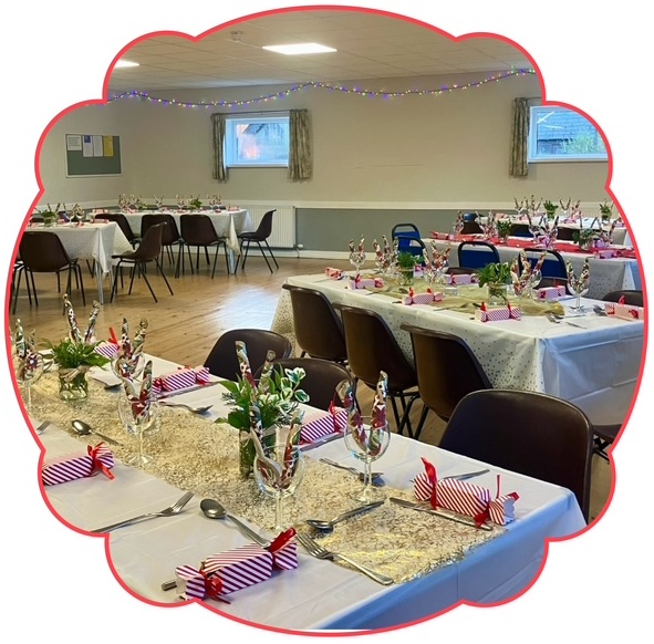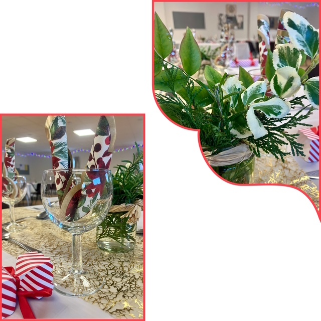 Tables had been furnished with sparkly cloths, flickering candles, be-ribboned crackers and lush seasonal foliage; twinkling fairy lights hung in swags around the room, and a Christmas tree was a commanding presence in the corner of the room. The scene was set for some serious feasting!