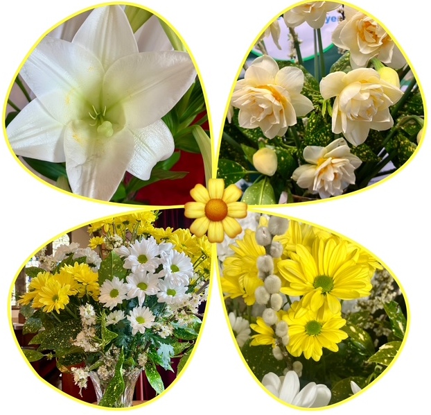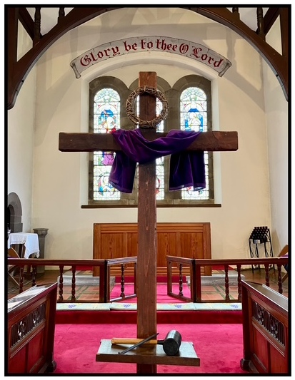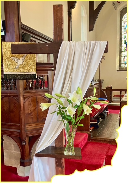 Once inside, the building exuded life. Excited and animated chatter hung in the air as parishioners, friends and neighbours exchanged ‘Happy Easter’ greetings whilst admiring the many artistic and lovingly-constructed floral arrangements. The cross, placed at the foot of the chancel steps had undergone its own transformation. Gone was its bleak, bare, austere appearance, enrobed now with a swath of pristine white fabric and majestic long-stemmed lilies. Death had given way to life…and a glorious one at that.