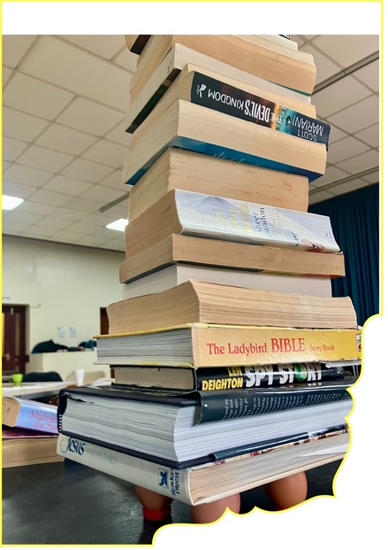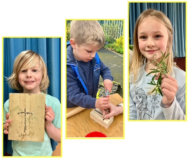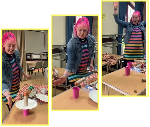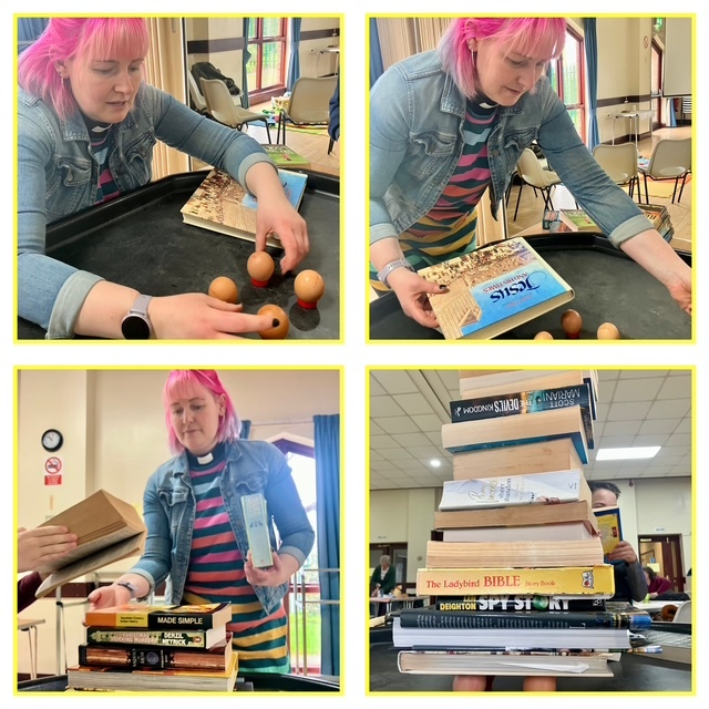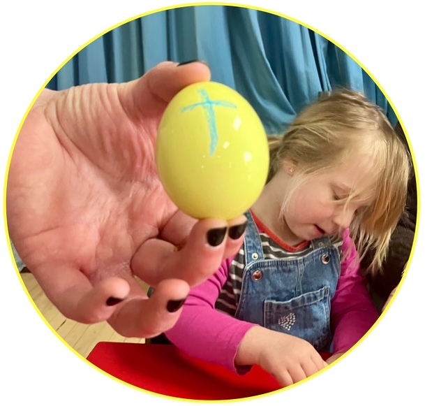 There was an opportunity to leave footprints in paint and then have feet washed clean and hard-boiled eggs were just waiting to be painted and decorated. Some ‘empty tombs’ were created using croissant dough, filled with a giant marshmallow dipped in butter and rolled in cinnamon sugar…during baking, the mallow melts and upon breaking open the flaky pastry, there is nothing inside! Crosses were nailed in wood and aromatic potions were developed, reminiscent of those taken by the mourning / morning women who visited the tomb of Jesus on Easter Day. The ‘test the strength of an egg’ challenge proved irresistible. Youngsters were fascinated by the 20+ book-tower which was supported only by four fresh eggs! Equally engaging, was the game which aimed to catch an egg (placed on top of a cardboard tube) in a cup of water underneath it, by whipping away the supporting paper plate! Not only did you have to eggs-pect the un-eggs-pected, in undertaking the mission, but you also had to be prepared for disaster!