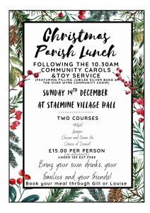 After the Carols / Toy Service. Please sign the notice in the church porch if you wish to attend. See Gill (07952 354684) or Louise with any questions / to choose your food.
