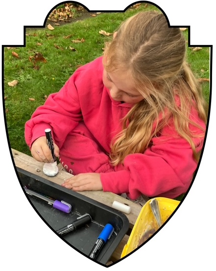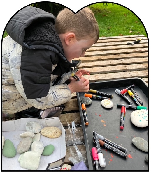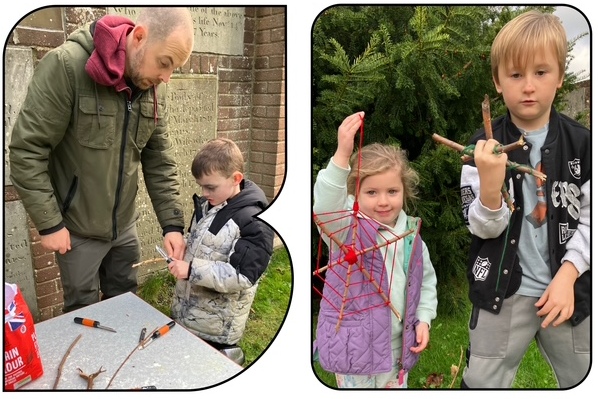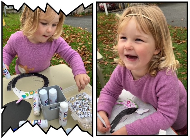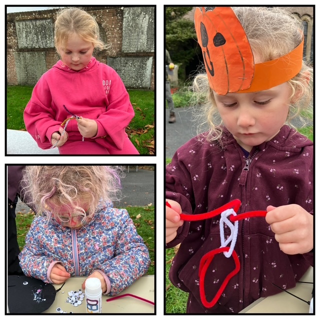 A range of activity stations within the grounds, each linking the trappings of Halloween to the kinder, more benevolent Christian focus, gave the children plenty to do for the next hour. Scooping the flesh out of pumpkins presented a time challenge, before the contents were mixed with cornflour and food colouring and transformed into a magical slime. Willow sticks were whittled, ready to hold ‘snake’ bread twists for baking over the flames of the fire pit. Pebbles and rocks were primed and ready for painting and decorating with joyful, bright colours. Intricate webs were woven across sticks, symbolizing our connection with each other and with nature. Snake mobiles were created from paper plates and decorated with interesting patterns and glorious colours, celebrating the wonders of creation.