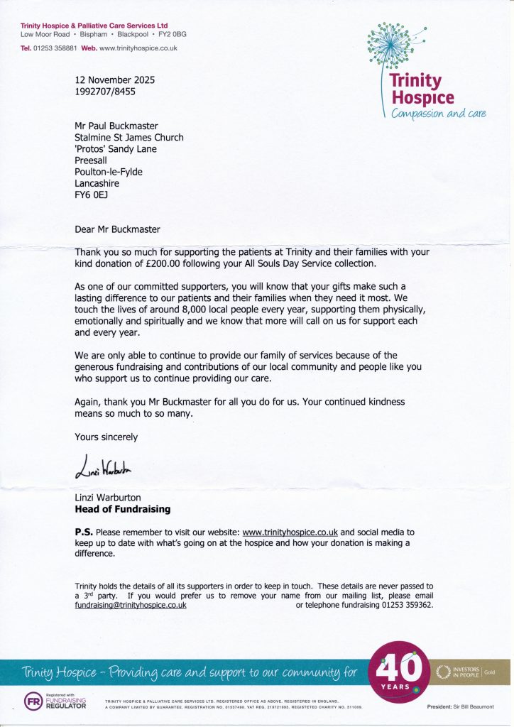As a result, we have been able to donate £250 to Christians Against Poverty; £500 to Macmillan Cancer Care; and £200 to Trinity Hospice.
